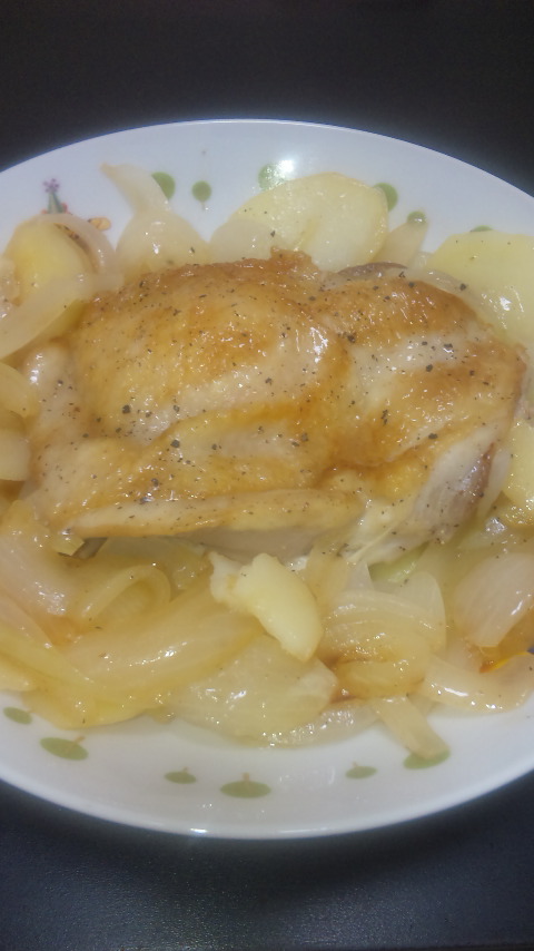 鶏肉とジャガイモ、タマネギを塩コショウでシンプルに作ったもの。