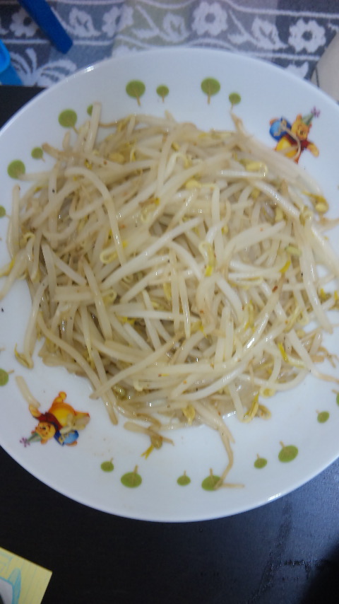 もやしを豆板醤と塩コショウで炒めるだけ。