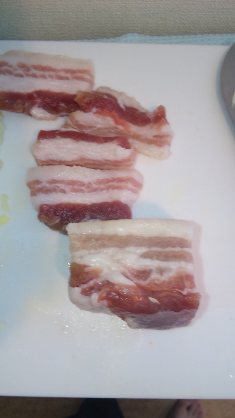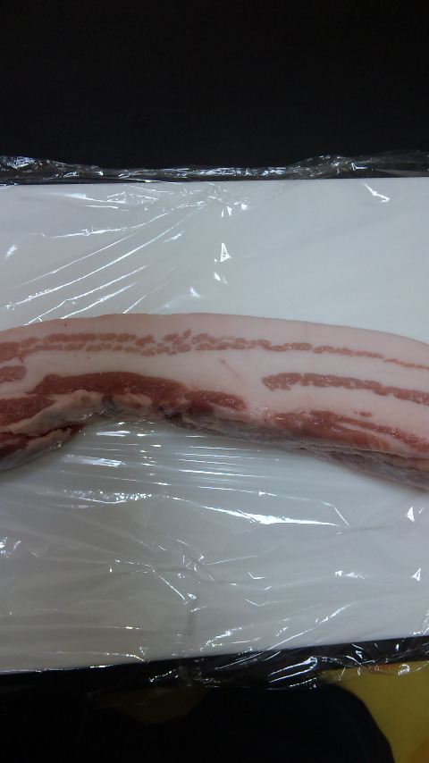 まず豚バラを塊で買ってきてまな板にラップを敷き、豚バラを載せる