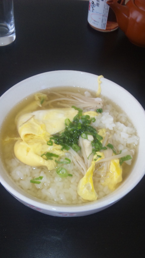 前日に作った鯛のすましに卵を加えてお茶漬けみたいにしてネギを加えただけ