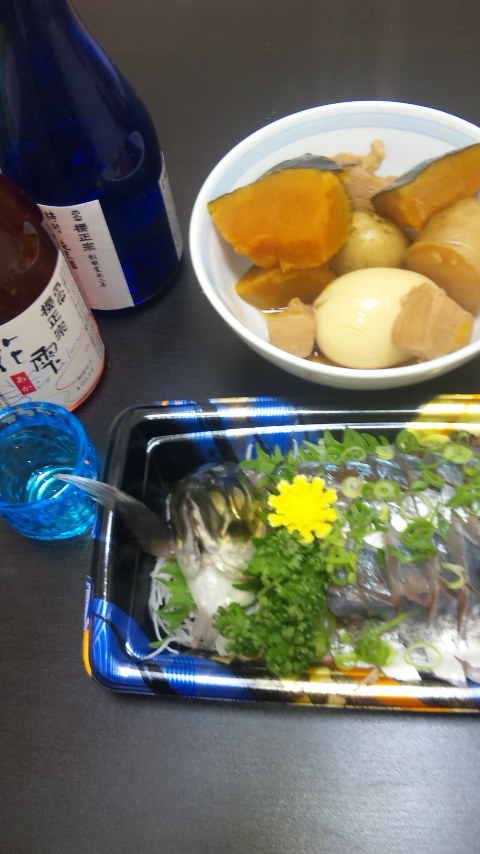 アジの刺身を買ってきたのと、前日の煮付けにゆで卵を加えて味をしみこませたもの